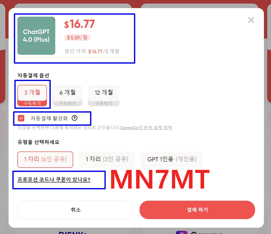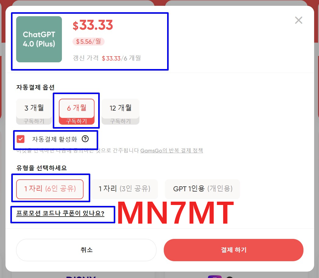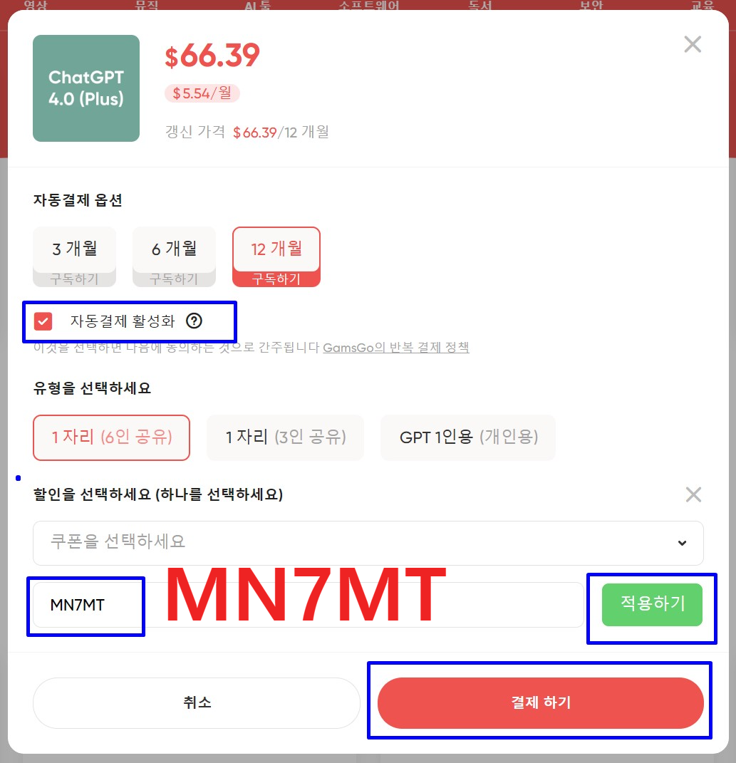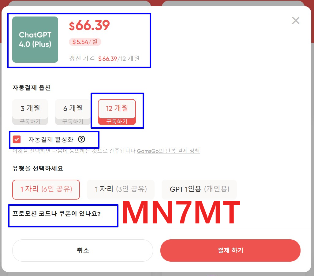 - 겜스고 접속 후 GPT-4o 요금제 선택