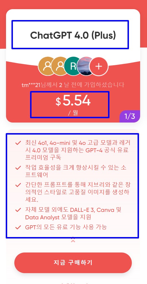 | GPT-4o (겜스고) | 동일 기능 + 공유형 요금제 | 월 3천 원대 |