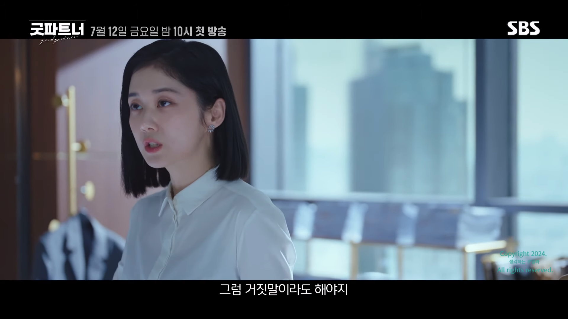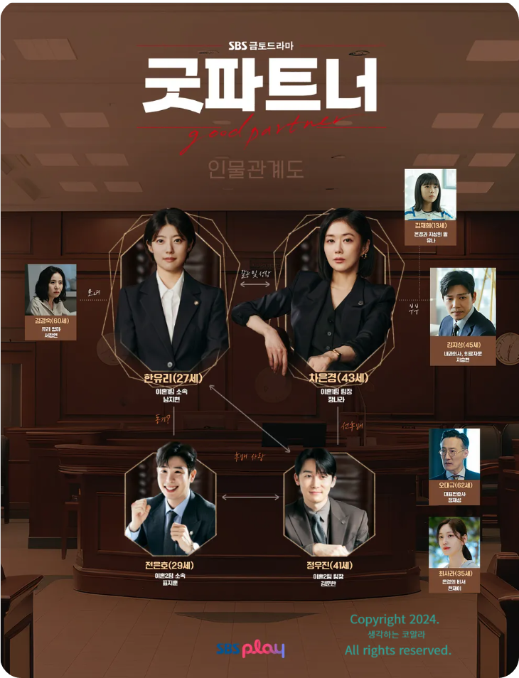 SBS 드라마 굿파트너는 2024년 7월 12일부터 방송 예정인 SBS 금토 드라마로, 이혼이 천직인 스타변호사 차은경과 이혼은 처음인 신입변호사 한유리의 차갑고 뜨거운 휴먼 법정 오피스 드라마입니다.