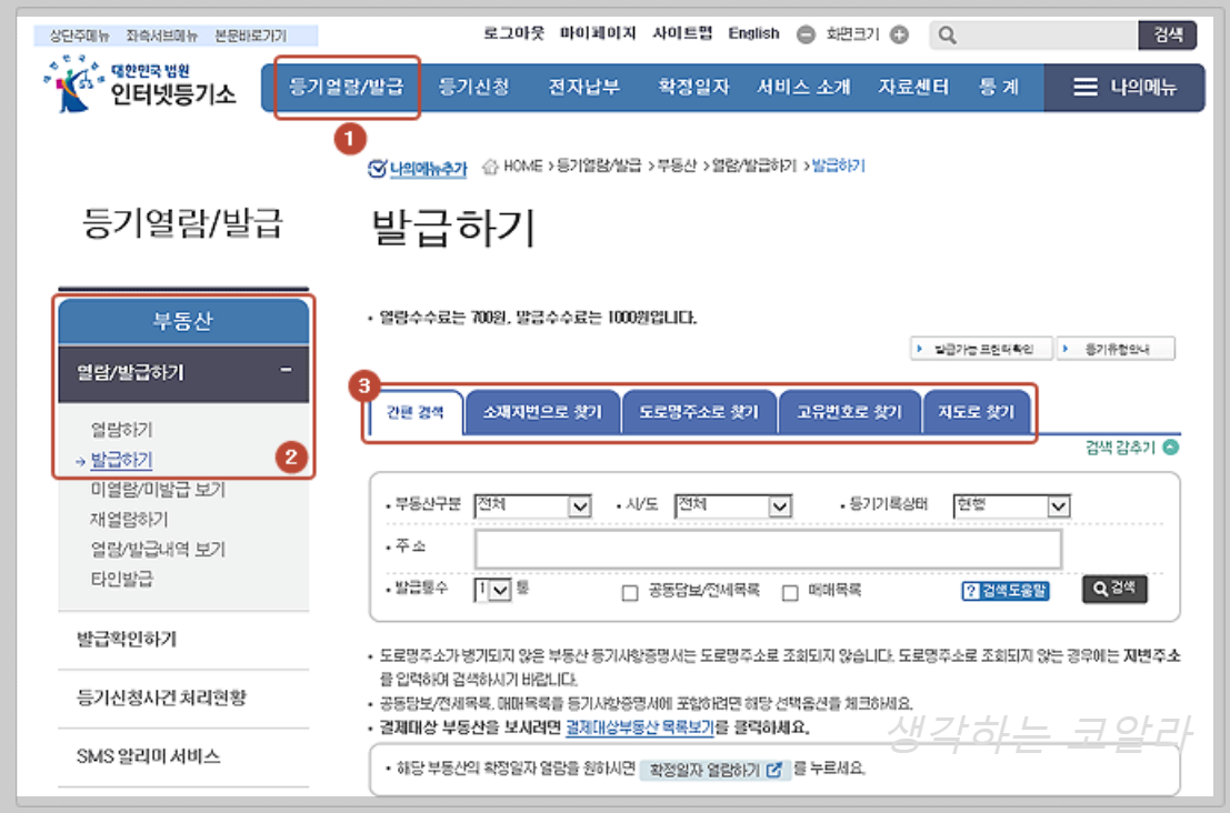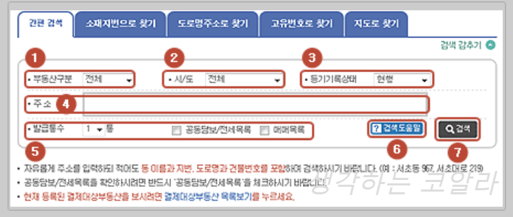 4. 검색 후 발급: 부동산 주소나 법인 등록번호를 입력하고, 원하는 서류를 검색한 후 발급받습니다.