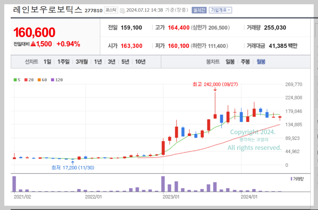 레인보우로보틱스의 월봉 차트는 장기적인 상승 추세를 보이고 있으며, 단기 조정 구간에도 빠르게 회복하는 모습을 보이고 있습니다. 거래량 증가와 긍정적인 기술적 지표 분석 결과도 주목할 만합니다.