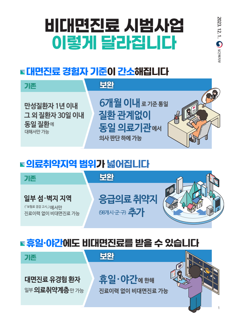 보건복지부(장관 조규홍)는 12월 1일(금) 비대면진료 시범사업 보완방안을 발표하였다.