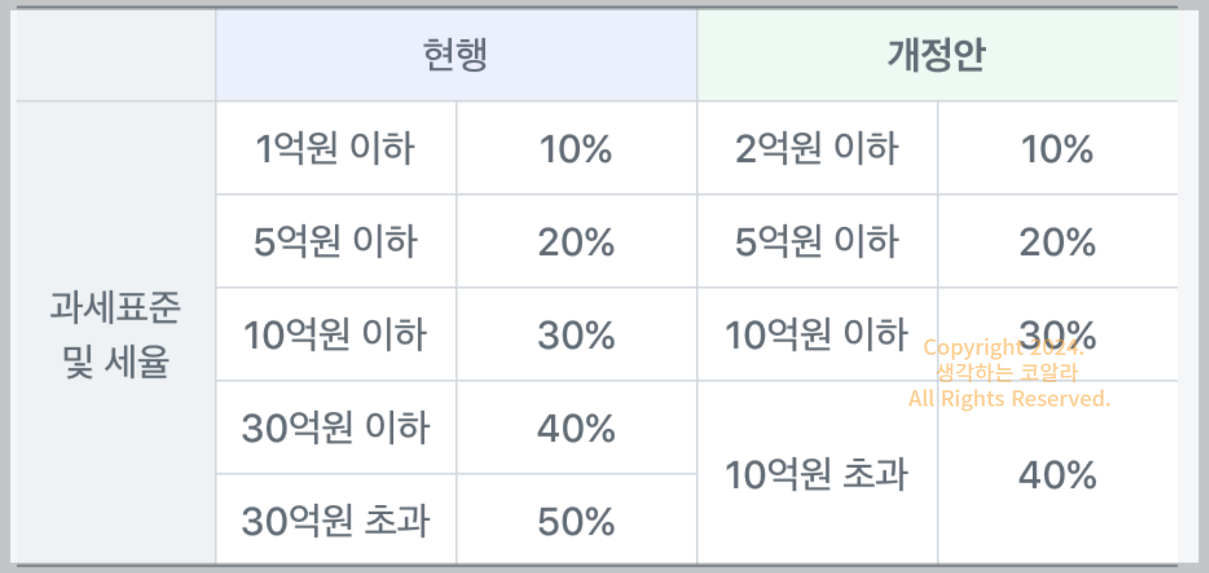 이번 개편은 세율, 과세표준(과표), 공제 항목 등을 모두 조정하여 상속세의 부담을 경감하고 공정성을 높이기 위한 것입니다.