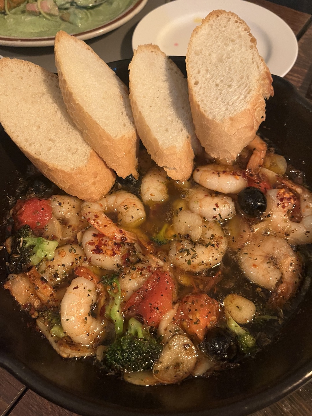 탱글한 적당한 크기의 새우가 한가득 끓고 있는 감바스~ 파스타와 곁들이는 서브 음식이라기엔 우리의 메뉴 선택이 과했지만, 주문하지 았다면 그 맛의 품격을 알지 못했을 감바스가 나타났다.