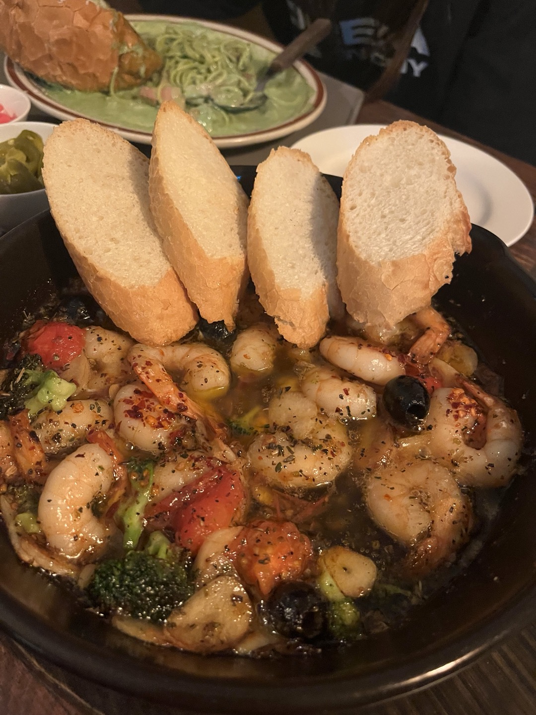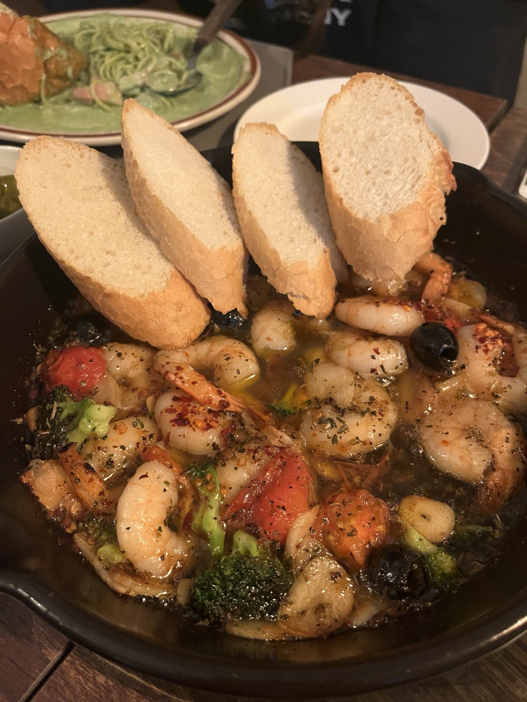 탱글한 적당한 크기의 새우가 한가득 끓고 있는 감바스~ 파스타와 곁들이는 서브 음식이라기엔 우리의 메뉴 선택이 과했지만, 주문하지 았다면 그 맛의 품격을 알지 못했을 감바스가 나타났다.