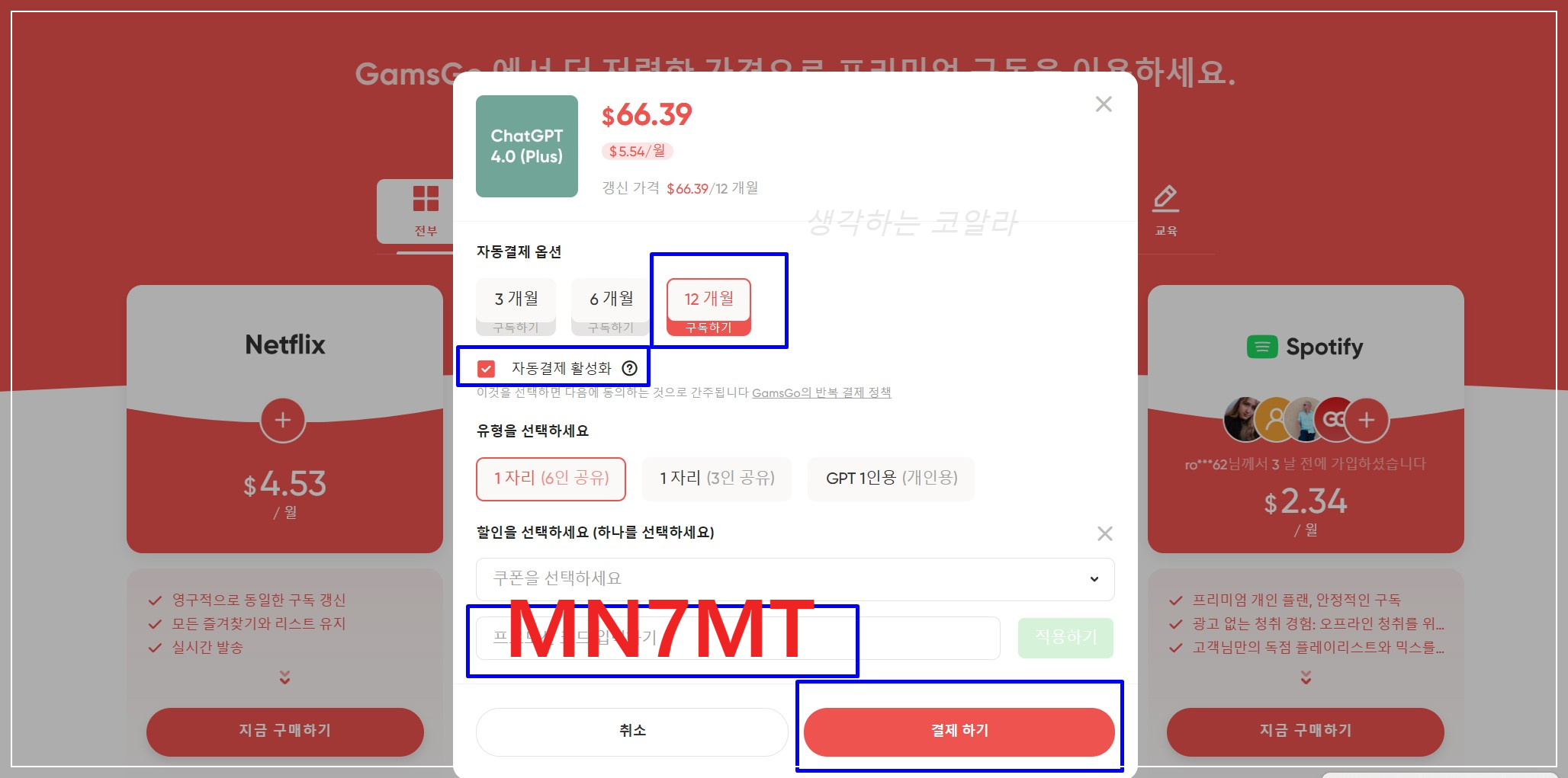 가입을 완료했으면, 이제 가장 중요한 결제 단계! 여기서 할인코드를 꼭 적용해야 해요. 방법은 아주 간단합니다: