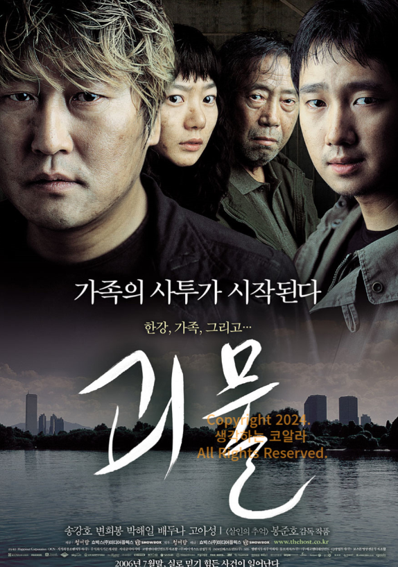 • 줄거리: 한 가족이 괴물의 공격을 받으며 서로를 지키기 위해 싸우는 과정을 그린 이야기입니다. 괴물은 한강에서 나타나 가족의 사랑과 유대감을 시험합니다. 가족은 위기의 상황 속에서 진정한 사랑과 연대를 발견하게 됩니다.